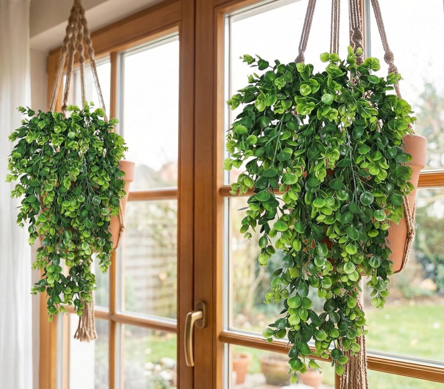 Artificial hanging plants outdoors leaves are made with high quality plastic material,Uv-resistant and waterproof for outdoor use,perfect decor for backyard.